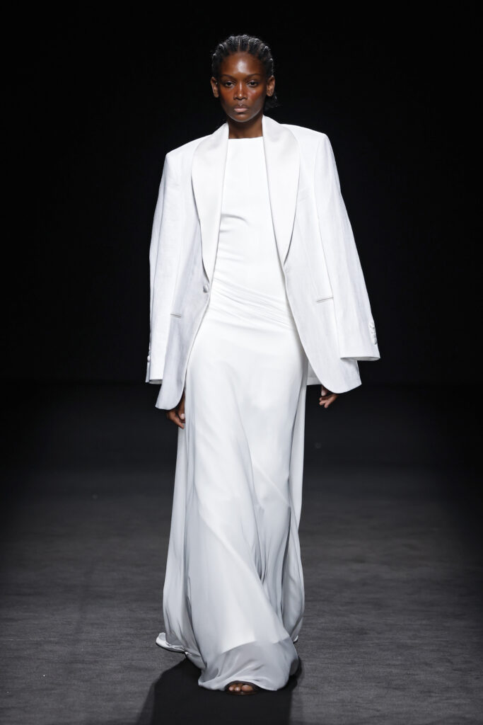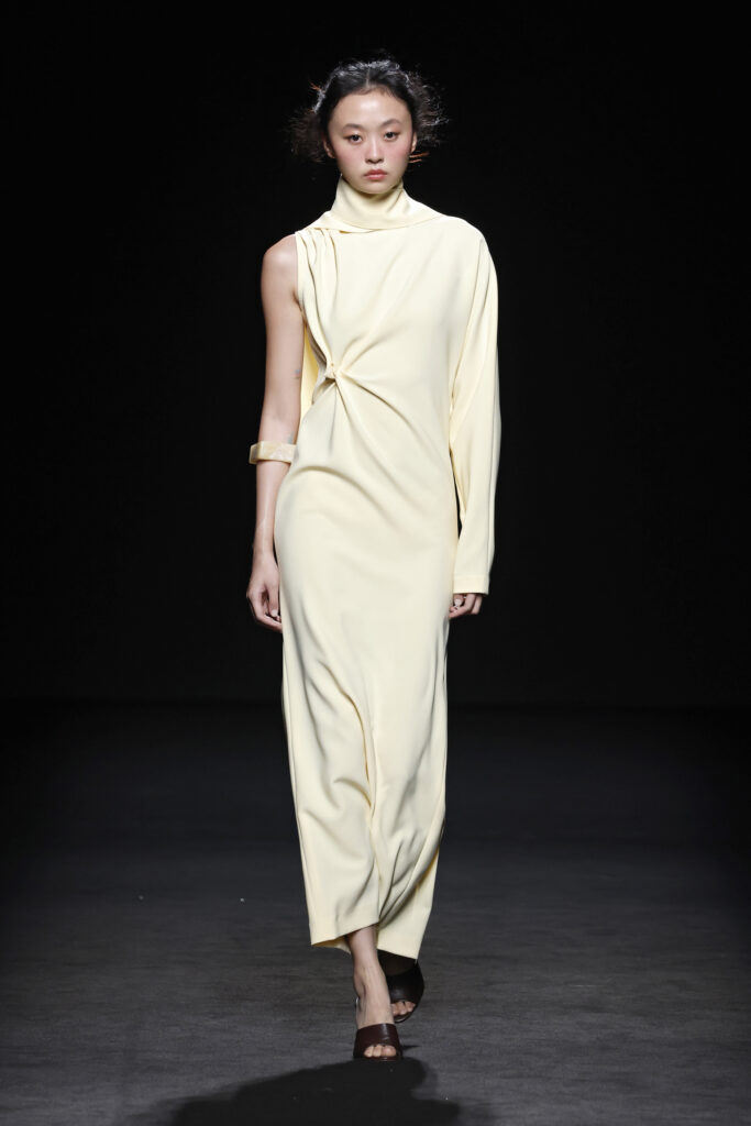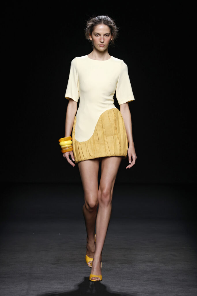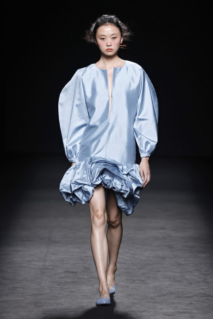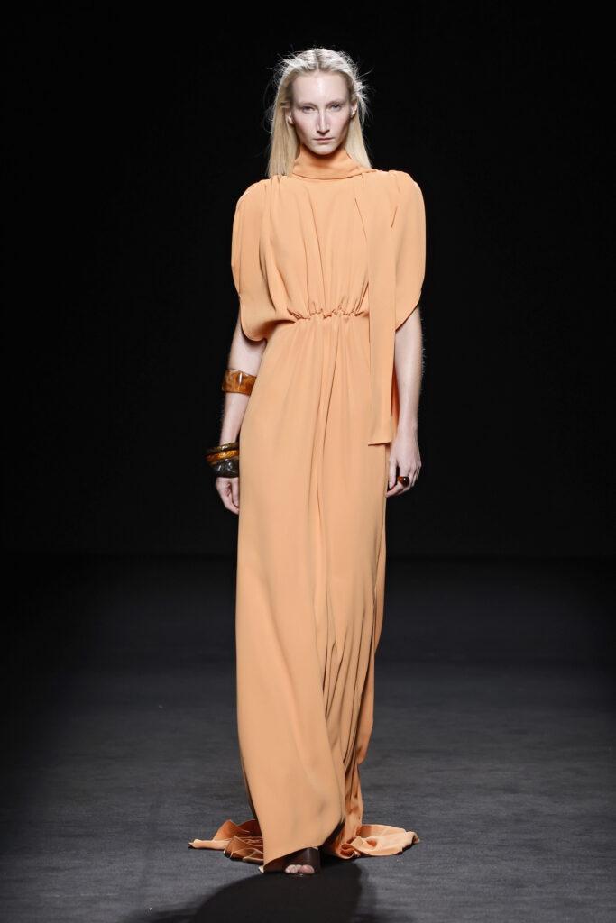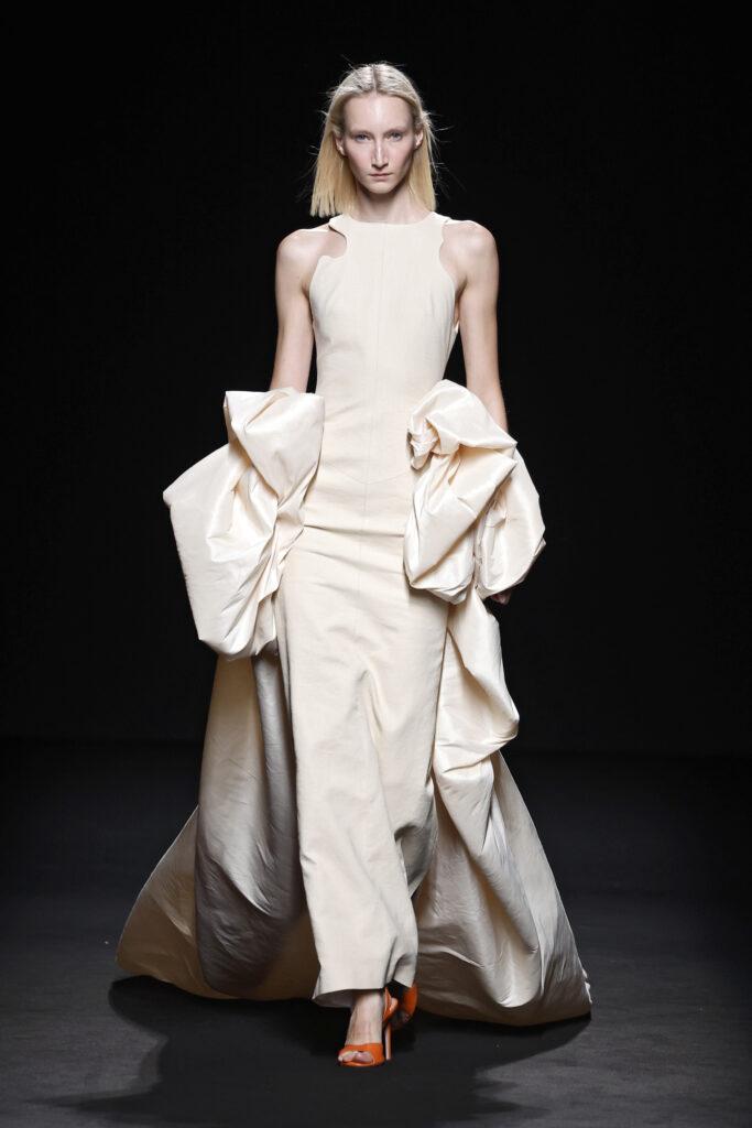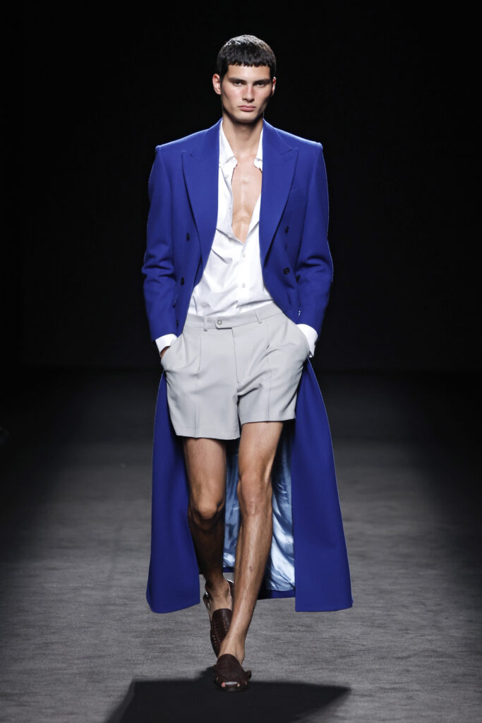 Entre las siluetas de la colección destacan los abrigos y trajes sastre, seña de identidad de la casa; ahora renovados gracias a la incorporación de bermudas, pantalones abombachados y tipo enagua; los vestidos longilíneos o abullonados y los caftanes ultra largos. La colección explora la gama cromática de los azules y amarillos, incorporando otros más vibrantes como el azul Klein y el naranja.