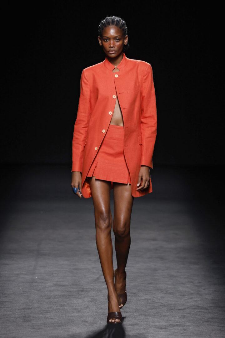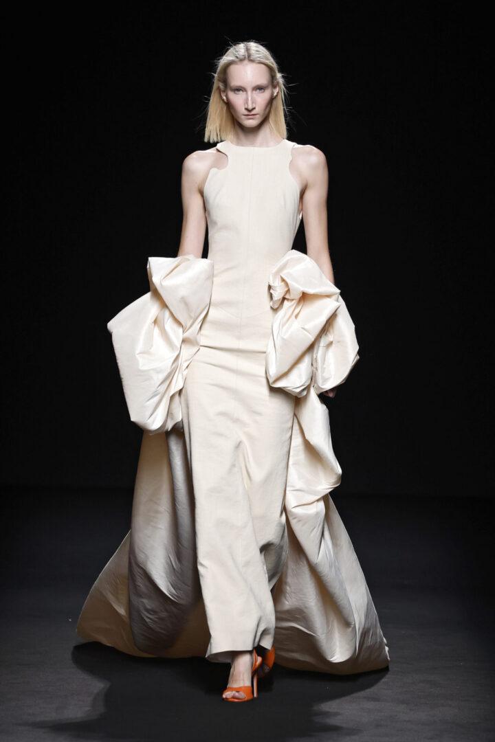 Entre las siluetas de la colección destacan los abrigos y trajes sastre, seña de identidad de la casa; ahora renovados gracias a la incorporación de bermudas, pantalones abombachados y tipo enagua; los vestidos longilíneos o abullonados y los caftanes ultra largos. La colección explora la gama cromática de los azules y amarillos, incorporando otros más vibrantes como el azul Klein y el naranja.